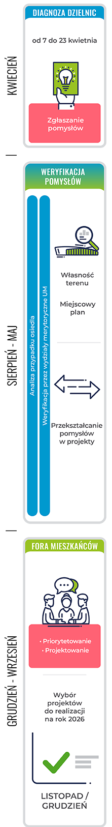 Sierpień – w tym czasie zgłoszone pomysły, które przeszły pomyślnie wstępną weryfikację, kierowane będą do wydziałów merytorycznych, celem przekształcenia w projekty, które zaprezentowane zostaną podczas jesiennych Forów Mieszkańców. Będzie to skosztorysowana i zweryfikowana propozycja projektów.
